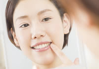 鏡を見て歯並びをチェックするにあたり、左右の口角の位置もポイントの一つ。左右の目の位置から唇の両端までの距離を見ます。この距離が均等でなければ、左右の咬み合わせがずれている可能性があるのです。また、笑ったときにも左右の口角の高さが異なっていないか、この点も注意してみる必要があります。